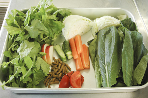 - ヌキナ、小松菜、木の枝、葉、リンゴ、トマト、ペレット2種、生ニンジン、生サツマイモ、季節の果物