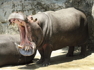 オスのカバはなわばりを争う時に,口を開けて下あごの犬歯を使って相手を攻撃します。