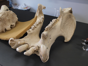 くちびるで草を食いちぎり、奥歯で左右にすりつぶして食べます。前歯と牙は相手を威嚇する時に使います。前歯と牙は一生伸び続けます。