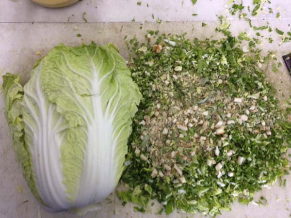 白菜、広島菜、パンを細かく切ったものに養鶏用配合飼料を混ぜています。