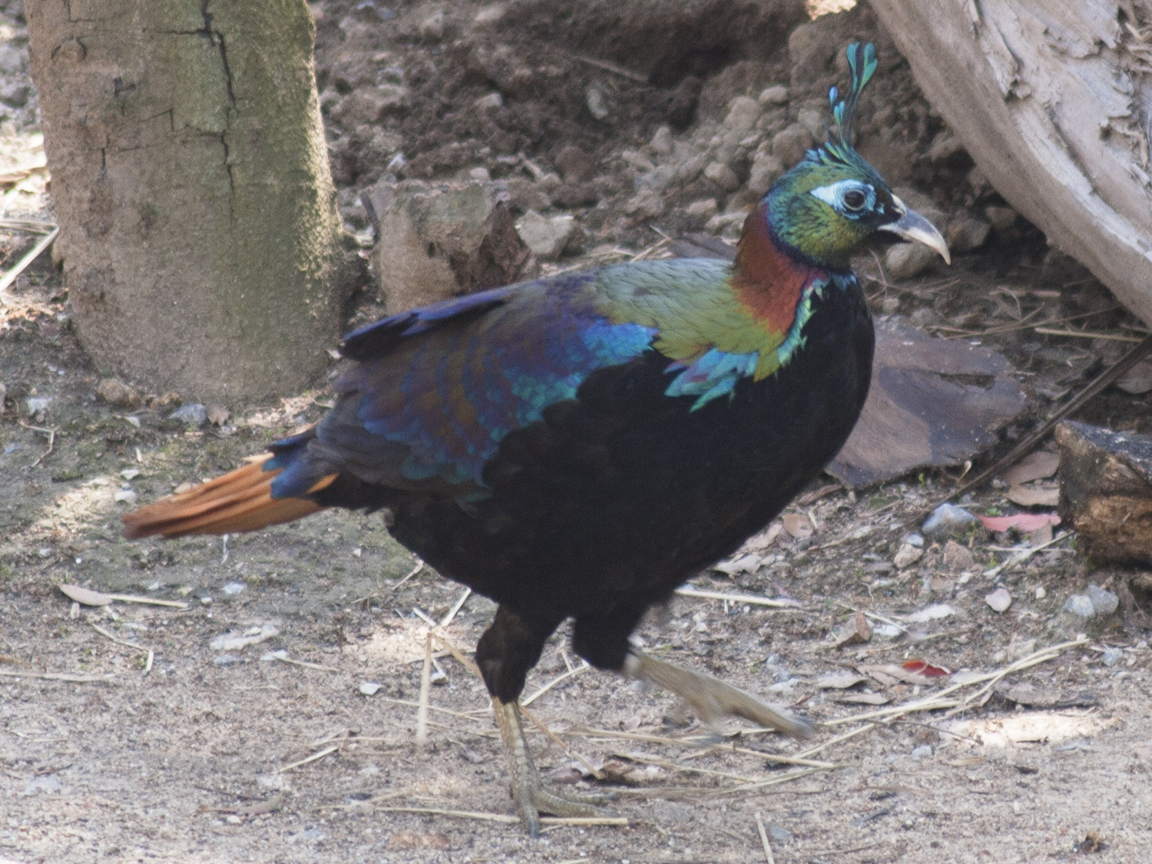 オスはメスに選んでもらえるために、とても綺麗な虹色の体をしていて、頭に冠羽があります。メスは敵に見つかりにくいように、茶色の目立たない羽の色をしています。写真はオスです。